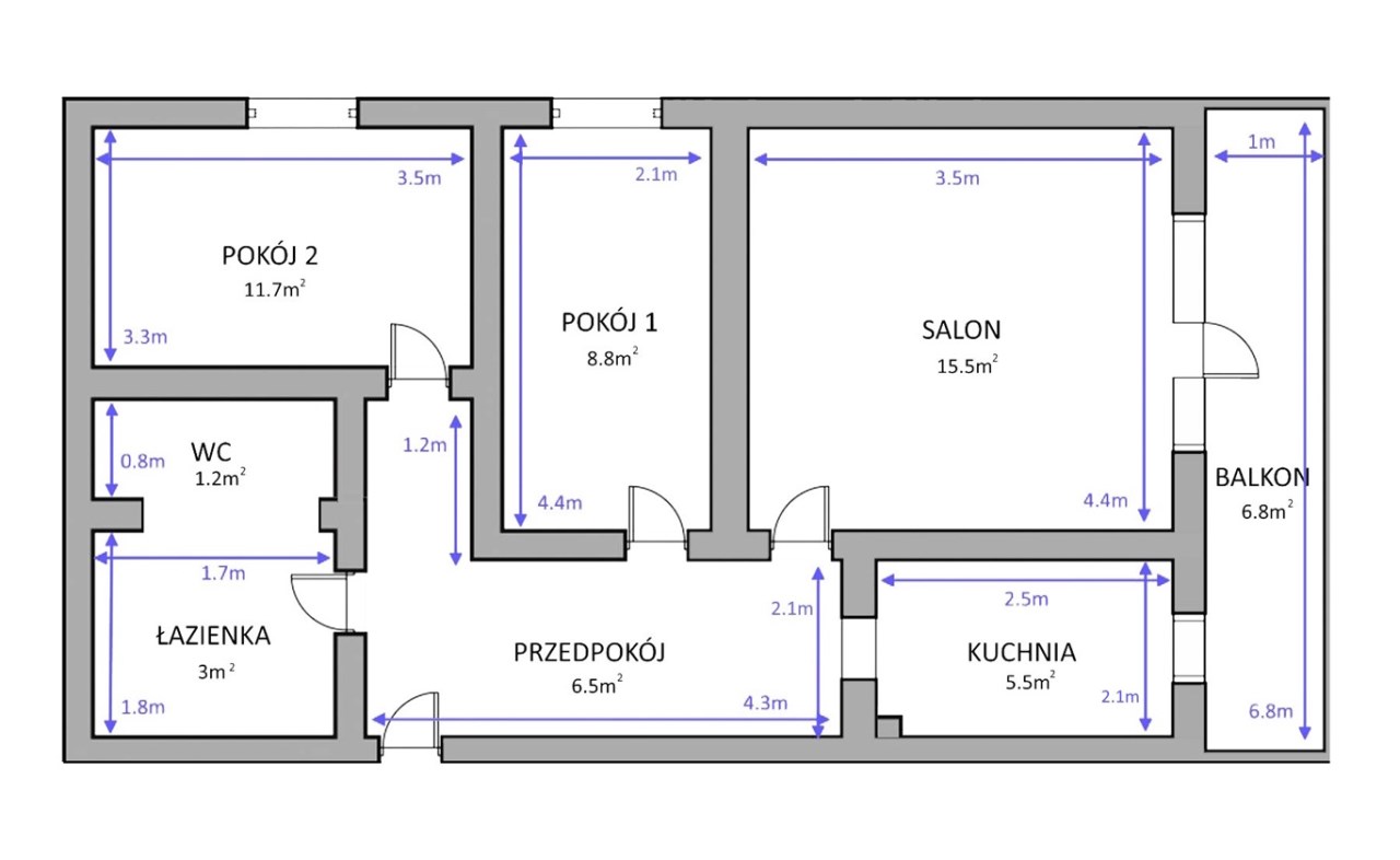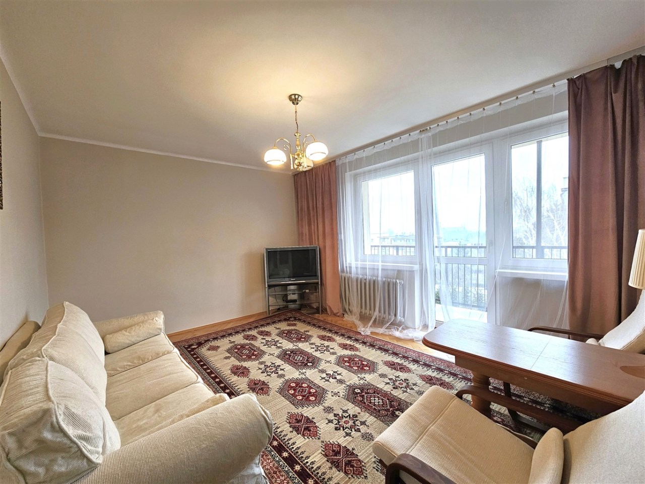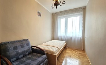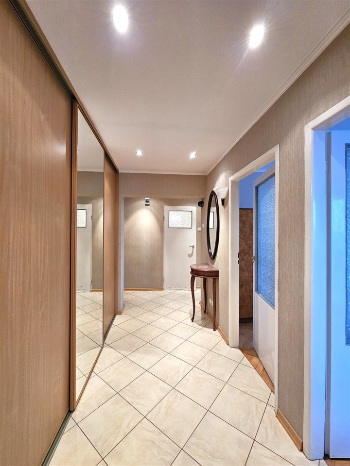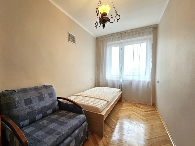 Dwie sypialnie, salon z balkonem, widna kuchnia, łazienka, WC, przedpokój, piwnica.